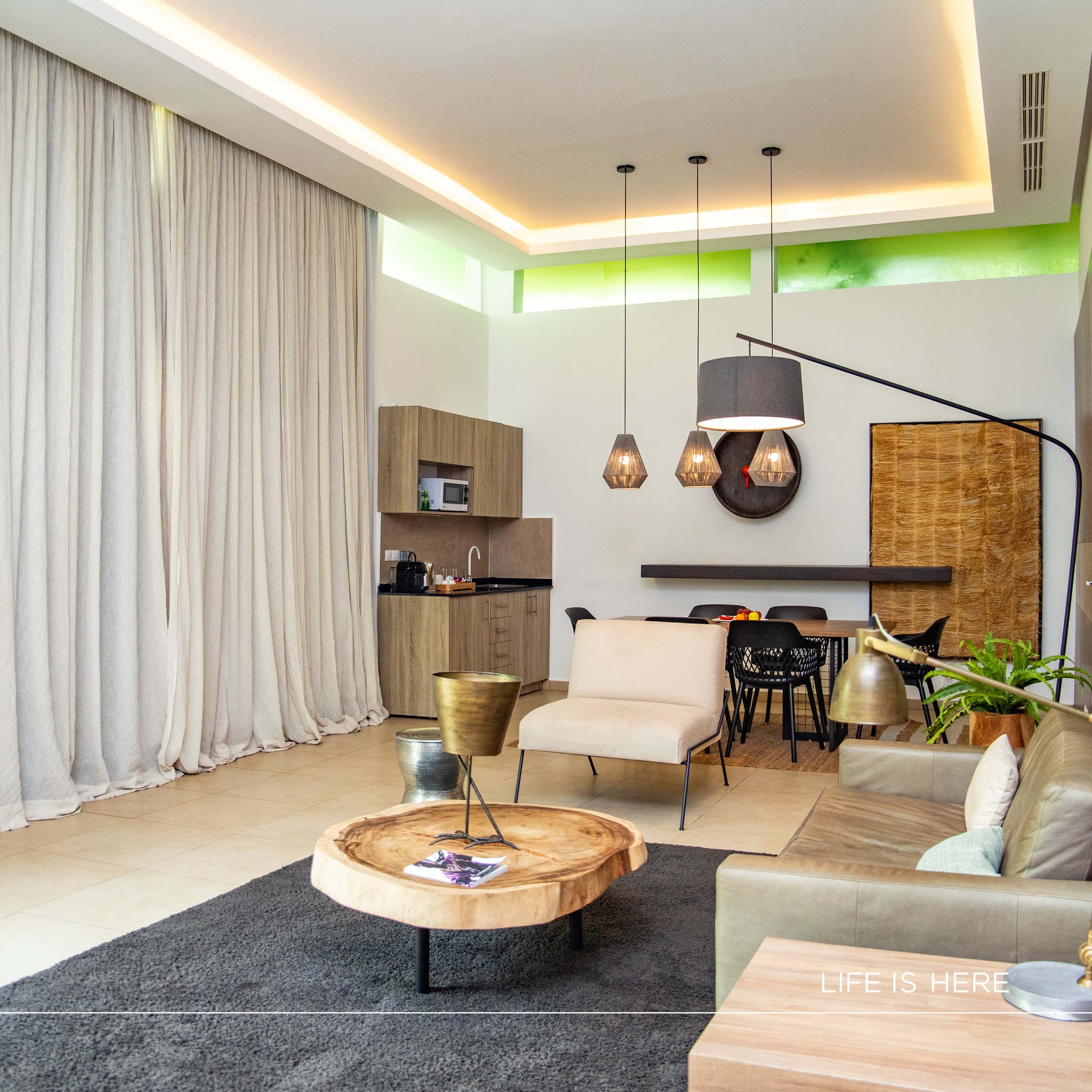 La déco ? Un savant mélange de modernité et de touches ouest-africaines : bois brut, sculptures locales, nappes brodées, et des petites lampes en raphia qui donnent une lumière chaude à tomber. Bref, un écrin qui te murmure à l’oreille : « Pose-toi, tu es chez toi. »